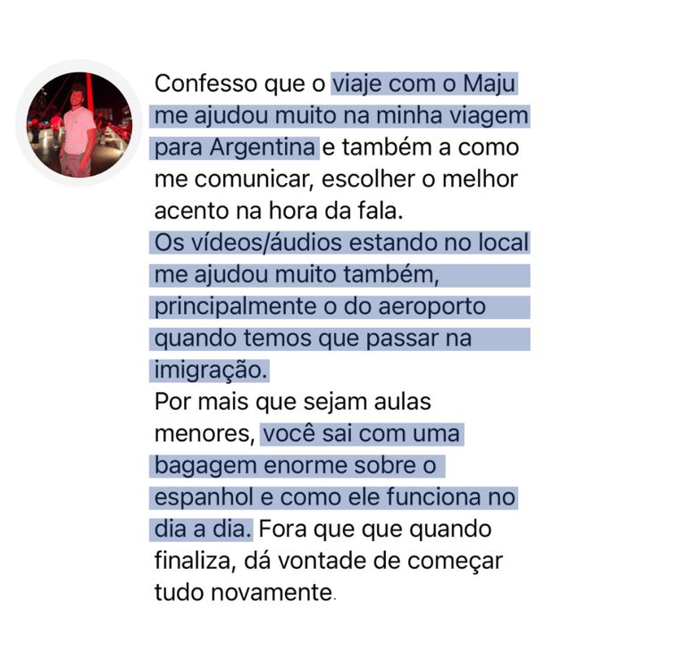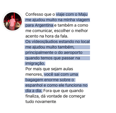 O guia é perfeito para quem vai viajar para país hispanohablante e quer se preparar de verdade. Pra quem quer se comunicar com confiança, não apenas “se virar” com portunhol. Para quem respeita a cultura local e busca conexões reais durante a viagem, mas não tem meses disponíveis para um curso completo de espanhol. É ideal para queles que querem aprender o essencial, o que realmente se usa em situações práticas. Para iniciantes ou para os que já sabem o básico, mas querem focar especificamente em espanhol para viagens. O guia completo Viaje con Maju é pra quem valoriza experiências autênticas e quer aproveitar 100% da sua viagem.
